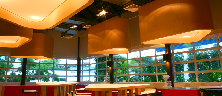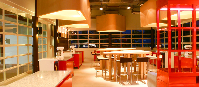 Yingcharoen Bakery school is a 5 baking islands plus a small bakery shop. In the center of the school is the collective table where students present their bakery to the teacher and each other.