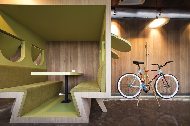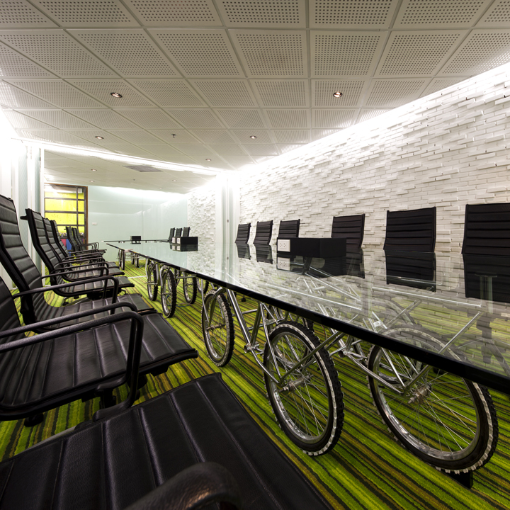 Every element of the office was meticulously designed to be both functional and fun. By reimagining the use of everyday objects, the space becomes familiar yet refreshingly innovative. For example, a bicycle meeting table can split into two smaller tables, adding flexibility and a touch of whimsy to meetings. The front lobby boasts a counter table on wheels, resembling a bus, that functions as a mobile café/bar, enhancing the communal living areas while serving as a front desk.